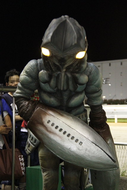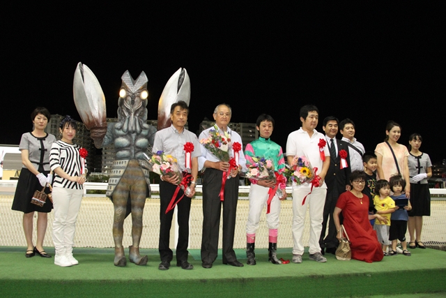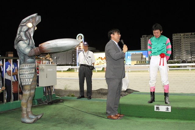 優勝騎手インタビューの間、勝利を称えるバルタン店長
