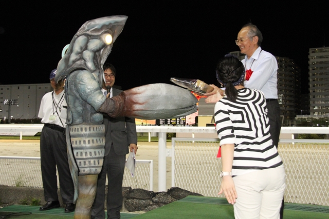 優勝したエスケイアリュール号の馬主:伊藤輔則様に 怪獣酒場グッズの詰め合わせを贈るバルタン店長 |