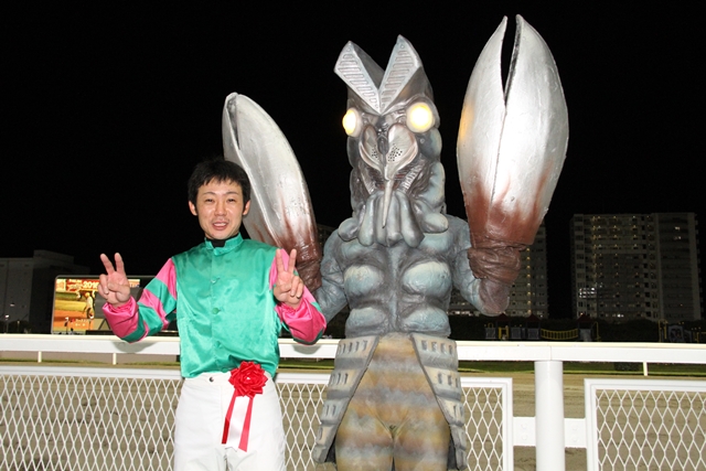 優勝ジョッキー:田中力騎手とバルタンポーズの2ショット |